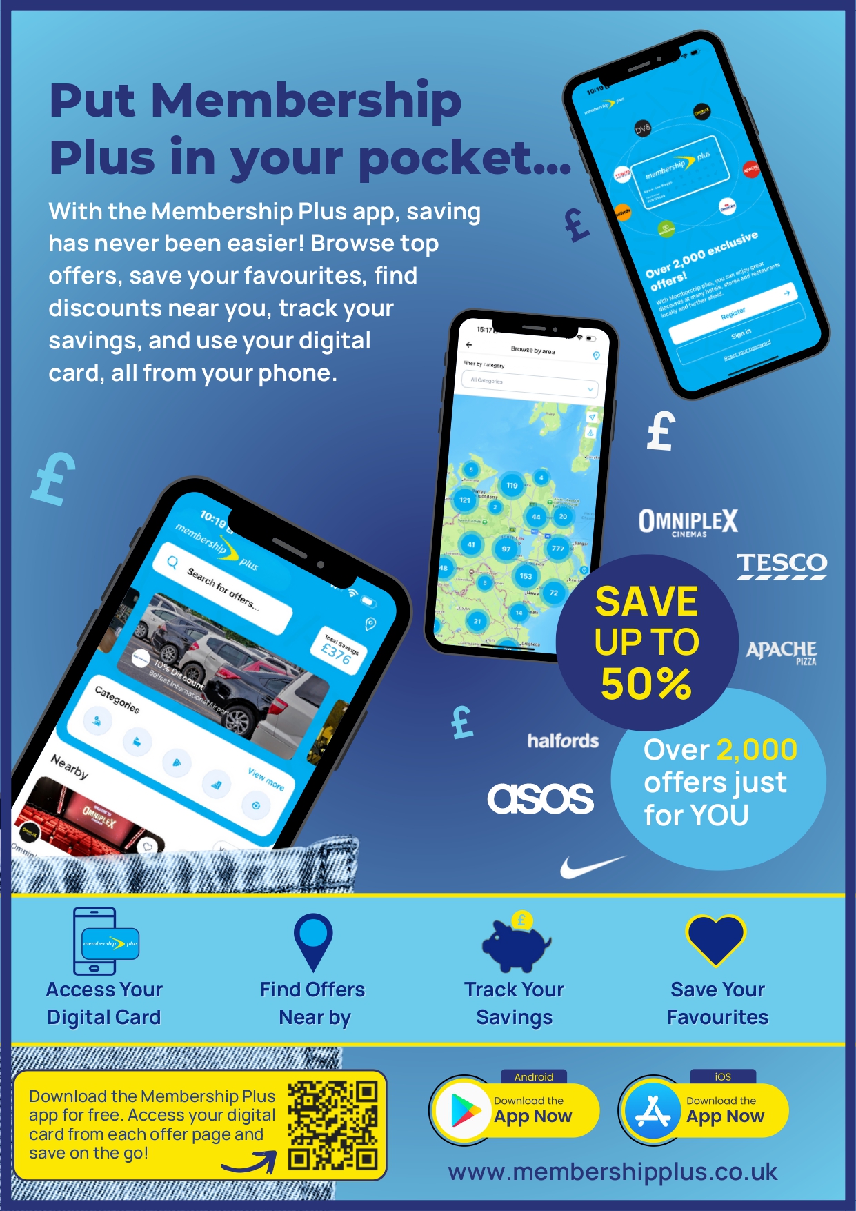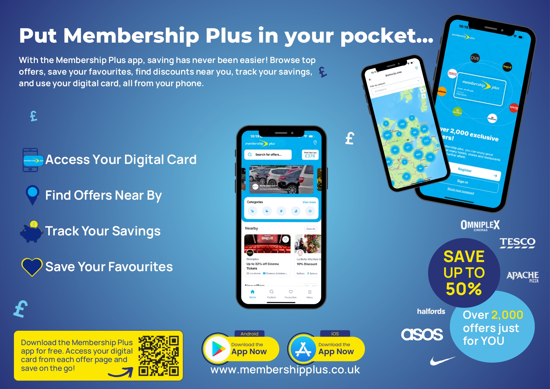 The Membership Plus app makes it easier than ever to save money on the things you love. With over 2,000 exclusive discounts available, you can access offers anytime, anywhere, right from your phone. Our offers range from local shops to big brands you know and love, with a mixture of instore and online offers there’s something for everyone.
